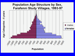 years= Categorías de edad-5 años Population=población Males= masculinos Females= femeninos Population age structure by sex, Farafenni study villages 1993-97= Estructura de la edad de la población por sexo, Aldeas del estudio Farafenni |