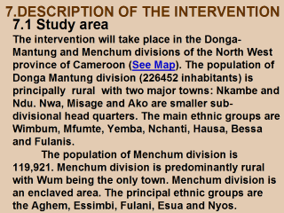 the population in these two divisions live in rural areas. In the North West province, there are 16 different church associations but the major ones are Baptist, Catholic and Presbyterian. The remaining 13 denominations include Deeper Life, Full Gospel, Apostolic, Church of Christ, Bahai and many other new generation churches. Table 3(table3.htm) shows an estimate of the population of different FBOs in the North West province. The major church denominations in the Donga –Mantung and Menchum divisions are the Baptist, Catholic and Presbyterian. Many new generation churches have come up in these divisions. Table 4 gives an estimate of the congregational members in these two divisions. |