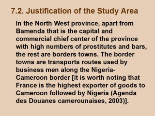 In addition, because of ethnic clashes in the Taraba and Benue states of Nigeria since two years ago, there is a concentration of pastoral refugees in Abongshie, Ako, Nkambe, Mayo-Binka, Sabong Gari, and Nwa. Because of the relative peace that reigns in Cameroon many Nigerian business men also troop into the country through these routes. Long-distant truck drivers with their characteristic multiple partners on settlements along these routes are common. Hence, these are high HIV/AIDS prone regions. Trans-border (Cameroon-Nigeria and vice-versa) transport workers on Rivers Donga and Mantung are also high risk groups.