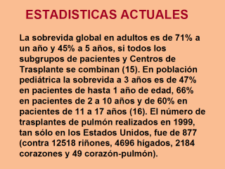 | En México se han realizado pocos trasplantes pulmonares exitosos (desde el punto de vista de sobrevida y calidad de vida) el primero fue realizado por el equipo del Dr. José Morales y Jaime Villalba, en el Instituto Nacional de Enfermedades Respiratorias en 1989. El último realizado el 21 de julio 2003 por el equipo del Hospital Universitario de la Cd. De Monterrey a cargo de los Dres. Rodolfo Posadas Valay, Luis Humberto Gómez Danés y Uriel Chavarría Martínez. |