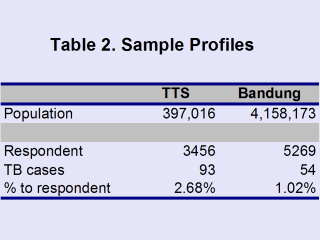 | There were a total of 3465 respondents in Timor Tengah Selatan (TTS) (Map 3.1) comprising 1715 males (49.5%) and 1750 females (50.5%). In Bandung (Map 3.1) a total of 5269 respondents were involved in the study with 2661 (50.5%) males and 2608 (49.5%) females. The age for the respondents ranged from 0 to 99 years in Bandung and 0 to 89 years in TTS. |