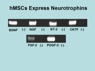 | RT-PCR shows the expression of mRNA’s encoding for brain-derived neurotrophic factor (BDNF), nerve growth factor (NGF), neurotrophin 3 (NT-3), ciliary neurotrophic factor (CNTF), fibroblast growth factor 2 (FGF-2), and platelet-derived growth factor C (PDGF-C). All samples were DNase treated. First strand synthesis was omitted as a negative control (-). (J.R. Munoz, J.A.Semon, R.L.Reger, C.A.Gregory, D. J. Prockop & J. L. Spees, submitted) |