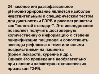 содержимого, при рефрактерности проводимого лечения, при подготовке больного к антирефлюксной операции) 24-часовая рН-метрия является необходимой. Изучение состояния моторики пищевода и его сфинктеров проводится с помощью манометрии. Она требуется для более точного размещения рН-электродов, определения тонуса нижнего пищеводного сфинктера, уточнения наличия грыжи пищеводного отверстия диафрагмы. |