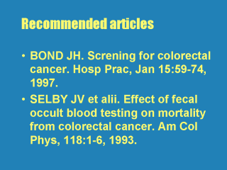 1. Steinberg SM et alii. Prognostic indicators of colon tumors: the Gastrointestinal Tumor Study Group Experience. Cancer 57(9): 1886-70, 1986. 2. Bruinvels DJ et alii: Follow up of patients with colorectal cancer: a meta-analysis. Annals of Surgery 219(2): 174-82, 1994. 3. Filela X et alii: Prognostic value of CA 19.9 levels in colorectal cancer. Annals of Surgery 216(1):55-9, 1992. 4. Fitzgerald SD et alii: Advanced colorectal neoplasia in the high-risk elderly patient: is surgical resection justified ? Diseases of the Colon and Rectum 36(2): 161-6, 1993. 5. American Society of Clinical Oncology: clinical practice guidelines for the use of tumor markers in breast and colorectal cancer. Journal of Clinical Oncology 14(10):2843-77, 1996. 6. Mandel JS et alii: Reducing mortality from colorretal cancer by screening for fecal occult blood - the Minnesota Colon Cancer Control Study. N Engl J Med May 13;328(19):1365-71, 1993. 7. Kronborg O et alii: Randomised study of screening for colorretal cancer with faecal-occult-blood-test. Lancet Nov 30;348(9040):1467-71, 1996. 8. Hardcastle JD et alii: Randomised controlled trial of faecal-occult-blood screening for colorretal cancer. Lancet Nov 30;348(9040):1472-7, 1996. 9. Mandel JS et alii: Colorectal cancer mortality: effectiveness of biennal screening for fecal occult blood. J Natl Cancer Inst Mar 3;91(5):434-7, 1999. |
