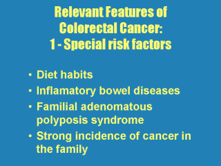 Although recent studies questioned the hole of high fiber and low fat diets in preventing colorectal cancer, healthy habits are the most secure way to prevent a series of other diseases - if not preventing you from having cancer, it sure will be useful for a lot of other situations. Inflammatory bowel diseases (such as Crohn and, specially, ulcerative colitis) are very well known risk factors for colorectal cancer. In fact, patients with ulcerative colitis must be submitted to a very close follow-up because of the high incidence of malignant colorectal lesions. Other syndromes than Familial Adenomatous Polyposis Syndrome, as Gardner, Peutz-Jeghers, Conkrite-Canada, Torres and Lynch, can course with colorectal cancer. A great prevalence of cancer in a given family generate the suspicion of oncogenes. In such cases, one must always keep in mind the possibility of colorectal carcinomas |