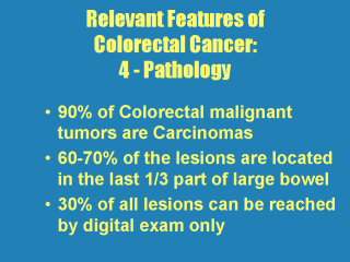 Even though some recent researchers state that "cancer is moving to the right side", most of lesions still are located at the last 60 cm of large bowel. It is a real tragedy that up to 33% of all cancers could be detected by a simple digital exam. |