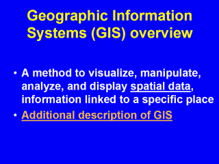 | Many people think of GIS as a set of mapping programs. A broader view of GIS would include any method to view the spatial relationships among different objects. For example, the United States Census 2000 can identify counties in America with the highest rates of poverty and superimpose the racial makeup of those counties using GIS. GIS allows the viewer opportunities to understand spatial information in a different way. |