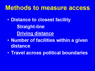 The most intuitive measure of access (described in geographic terms) is the straight-line distance between a patient and the closest facility. The driving distance between the two points would seem to be a more accurate measure. Other measures include other facilities or travel across state or county boundaries. No one has compared the validity of one measure against another or a "gold standard." For this presentation, we will focus on the driving distance to the closest facility.