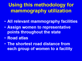 For this project, we needed three different sets of data. First, we needed the addresses of all mammography facilities in and around the state. Second, we needed a way to accurately model the location of women within Vermont. Finally, we needed an electronic road atlas that included all roads that could be used by a woman to get to a mammogram facility. These pieces of information could then be used to determine the shortest road distance for Vermont women to their closest mammogram facility.