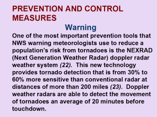 | Unfortunately, in 1990, doppler radar coverage had not yet extended to include the region of Plainfield, Illinois. The Plainfield tornado (F-5) resulted in 28 fatalities and 274 injured people (22). The extremely short time period between the tornado warning and the tornado's arrival in Plainfield and the odd shape of this particular tornado's funnel cloud made it difficult for observers to recognize the approaching storm as a tornado. |