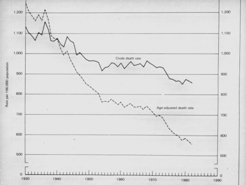 Taxas brutas de mortalidade e de idade-ajustadas, nos EUA (1930-1988)
