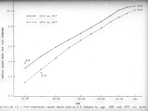 | Taxas de mortalidade de mulheres, por câncer não pulmonar, por idade, nos EUA, nos anos de 1935 e 1975 |
