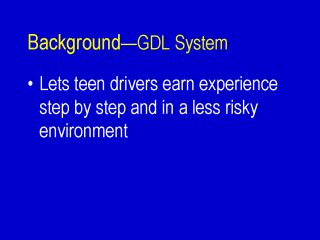 Since age and experience both played an important role in teenagers’ increased risk of crashes, increased attention has been given to graduated licensing systems (GDL). The basic premise of these systems is that beginning drivers need to earn a full license step by step and in less risky environments. This approach has been adopted in New Zealand, Canada, and several states in the United States and has been found to reduce teenage driver crashes. |