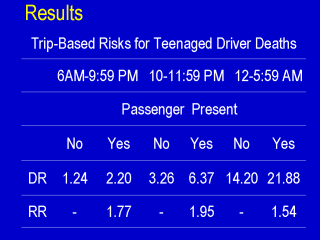 For drivers aged 16 and 17 trip-based driver death rates (DR) were higher when passenger present during both day and night. The relative risk (RR) was 1.5 or higher for all periods (i.e., at least a 50% increase in risk) |