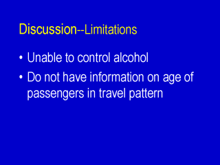 Alcohol consumption is a major risk factor for involvement in fatal crashes; unfortunately, we were unable to control it in this study because of lack of the alcohol information on the teenage driving population. Passenger’s age is another factor we wished we could explore further but were unable to do so. |