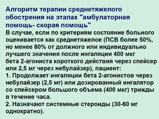 индивидуально лучшего значения) больной может быть оставлен дома. Пациент должен: 1. Продолжать ингаляции бета 2-агонистов по 2,5 мг через небулайзер или по 400 мкг через спейсер каждые 4 часа в течение 2 суток. 2. Принимать системные стероиды в дозе 40-60 мг в один или два приема в течение 3-10 дней. В случае, если пациент ранее получал ингаляционные кортикостероиды, рекомендуется увеличение их дозы в 2 раза. Если больной не принимал ингаляционные кортикостероиды, то необходимо начать их прием в средних или высоких дозах. Пациент должен находиться под наблюдением в течение 3-7 дней, так как сохраняется вероятность развития повторного обострения. Если в течение еще одного часа при среднетяжелым обострении эффект от проводимой терапии неполный или отсутствует, то больной должен немедленно обратится за медицинской помощью и должен быть госпитализирован в отделение пульмонологии или реанимационное отделение. При транспортировке больного в машине "скорой помощи" продолжают ингаляции бета 2-агонистов, добавляют ингаляции атровента, который вводят с помощью небулайзера (0,5 мг) или спейсера (4-8 вдохов) каждые 30 минут 3 раза, затем каждые 2-4 часа по необходимости. Можно смешивать сальбутамол и атровент в одном небулайзере. При возможности - кислородотерапия. |