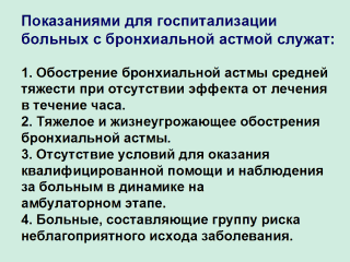 неблагоприятного исхода). К ним относятся: 1. Наличие в анамнезе жизнеугрожающего обострения бронхиальной астмы. 2. Наличие в анамнезе эпизода ИВЛ по поводу обострения бронхиальной астмы. 3. Наличие в анамнезе пневмоторакса или пневмомедиастинума. 4. Госпитализация или обращение за экстренной медицинской помощью в течение последнего месяца. 5. Более двух госпитализаций в течение последнего года. 6. Более трех обращений за экстренной медицинской помощью за последний год. 7. Использование более 2 баллончиков бета-агонистов короткого действия за последний месяц. 8. Недавнее уменьшение или полное прекращение приема ГКС. 9. Наличие сопутствующих заболеваний (например заболеваний сердечно-сосудистой системы или хроническая обструктивная болезнь легких). 10. Психологические проблемы (отрицание заболевания). 11. Социально-экономические факторы (низкий доход, недоступность медикаментов). 12. Низкая приверженность к терапии. |