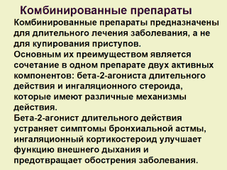 кортикостероиды. Преимуществами комбинированного препарата также являются: улучшение комплаенса (то есть готовности пациента выполнять врачебные рекомендации), так как больной использует одно вместо двух ингаляционных устройств, снижение стоимости (комбинация всегда стоит дешевле, чем отдельные препараты), а также простота и удобство. Дополнительным преимуществом применения фиксированных комбинаций является и то, что пациент не может самостоятельно прекратить прием одного из препаратов, входящих в состав комбинации. Представляет интерес сообщение о достижении более высоких показателей легочной функции при применении комбинированного препарата, чем при раздельном использовании составляющих компонентов. |