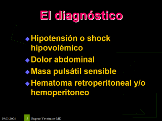 caracterizado por: hipotensión o shock hipovolémico, dolor abdominal, masa
