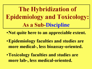 In reality, the hybridization into such a sub-discipline is far from completion. There are reasons for this incompletion. One reason is that epidemiology faculties and their work still are very much statistically, medically, clinically, or otherwise observation oriented. Toxicology faculties and their work, on the other hand, are more laboratory and experimentation oriented. A third reason is that the conception and the movement of health risk assessment are still in their infancy, even in industrial countries. As a matter of fact, toxicology was not well recognized or accepted as an academic discipline until perhaps after the mid 1980s, the time when public health as well as epidemiology began to flourish to a popular subject in graduate schools of public health in the United States.
