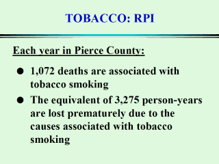 causes of death k. SAMk were calculated as SAMk = DEATHSk*SAFk , where DEATHSk is the number of deaths due to cause k, SAFk is the smoking-attributable fraction defined as SAFk = [E0 + E1*RR1(k) + E2*RR2(k) - 1]/[E0 + E1*RR1(k) + E2*RR2(k)], where E0, E1, and E2 are the proportions of, respectively, never smokers, current smokers, and former smokers. RR1(k) and RR2(k) are the relative risks of death due to the cause k among current smokers and former smokers, respectively. Smoking attributable years of potential life lost is defined as SAYLLk = SAMk*YPLL65k , where YPLL65k - years of potential life lost per one death due to cause k, defined as the average difference between 65 years and age of death. |