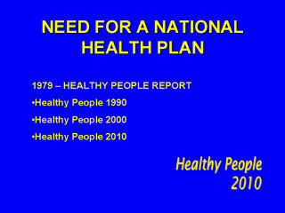 | In 1979, the Surgeon General’s Report entitled, HealthyPeople: The Surgeon General’s Report on Health Promotion and Disease Prevention, documented national goals for reducing premature deaths andpreserving independence for older adults. In 1980, another report, Promoting Health/PreventingDisease: Objectives for the Nation, outlined 226 targeted health objectives for the Nation to achieve over the next 10 years. Healthy People 2000: National Health Promotion and Disease Prevention Objectives (released 1990),identified health improvement goals and objectives to be reached by the year 2000.This was the very first time a National Health Plan was formulated. |