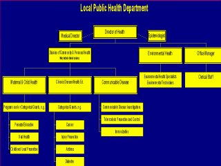 Click this slide to see a larger image | This slide shows an example of how a local public health department (lphd) might be organized to deliver services. Traditionally, public health departments provide environmental health services, maternal and child health services and communicable diseases. Because the leading causes of death include chronic diseases, contemporary lphd’s might include a department to address chronic illnesses and injuries. A lphd may also provide emergency medical services as well. Larger public health departments may have an epidemiologist and/or biostatisticians on staff. |