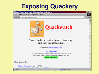 “Quackwatch” contains over thirty pages of material and tries to do a good job of warning people about medical frauds, questionable products and services, dubious claims and theories, etc. But who is to say what is quackery? There are articles on acupuncture, dietary supplements, osteopathy, and why nutritionists should be licensed, just to name a few controversial subjects. |