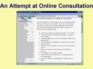 In 1998 Mediconsult.com offered a report from one of a panel of experts for $195. This service no longer is available in 2000.