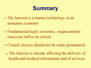 Similarly, it is probably too early to know all the ways the Internet will change the delivery of health information AND of health services. Nevertheless, I believe there is justification for concerns. We need to monitor health and medicine applications on the Internet, especially those available to the public, to insure high quality and conformity to reasonable standards.