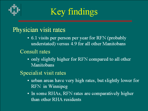 Six RHAs do show higher specialist visit rates for RFN compared with other residents in the region: Churchill, Nor-Man, Burntwood, Parkland, Marquette, South Westman. |