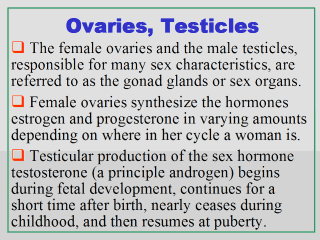 The gonads are the female’s ovaries and the male’s testicles, or otherwise more commonly referred to as the sex (or sometimes also the reproductive) organs. In addition to producing gametes (ova and sperms), these sex organs secrete hormones. As mentioned earlier (Slide 8), the secretion of these sex hormones by the gonads is controlled by pituitary gland hormones such as the FSH (follicle-stimulating hormones) and LH (leutinizing hormones). While both sexes make some of each of these hormones, male testicles secrete primarily androgens of which testosterone is the principle one. Female ovaries make estrogens and progesterone in varying amounts depending on where in her cycle a woman is. In a pregnant woman, the baby’s placenta also secretes these hormones to help maintain the pregnancy.