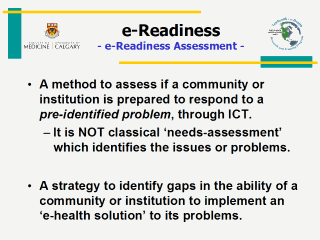 readiness assessment has been done for e-learning and e-business purposes. Organizations should have a readiness strategy that is supported by the needs-assessment and is aligned with the organization’s business plan. |