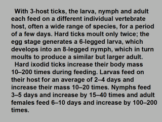 | All tick stages feed only once per stage, with the exception of the adult male, which can feed several times or not at all. It increases its body mass only by 2. Copulation usually takes place on a host before blood feeding shortly after which the male dies. A few weeks later, the female lays between 1000 and 5000 eggs. |