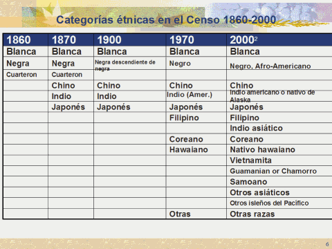 Censo EUA. 1 En 1890, mulato fue definido como una persona que tenia 3/8- a 5/8 de negro. Un cuarteron twnia 1/4 de negro y octoron 1/8 de negro.2 Categorías impresas en el cuestionario del Censo del 2000 |