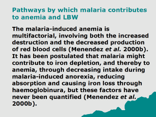 Malaria is thought to reduce birth weight through a combination of systemic and localized effects. Firstly, malaria may affect birth weight through malaria-induced anemia. Secondly, malaria may reduce birth weight through placental infection (Menendez et al. 2000b). In the latter case, parasites either directly cause a mechanical compromise of placental circulation or indirectly interfere with placental functions and/or induce pathological lesions (Walter et al. 1982). |