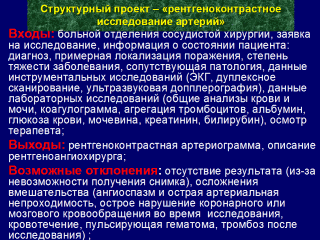 сосудистая операция при развитии местных осложнений); Участники процесса: больной, лечащий врач, постовая медсестра, врач-рентгеноангиохирург, медсестра и рентгенолаборант ангиографического кабинета, ангиографическая установка и расходный материал; Контрольные пределы для подпроцессов (время транспортировки заявки в ангиографический кабинет, время и характер осмотра больного врачом-рентгеноангиохирургом, критерии возможностей выполнения ангиографического исследования, время подготовки больного к исследованию, критерии готовности, время транспортировки больного в ангиографический кабинет, время и соответствие стандарту выполнения ангиографического исследования, время транспортировки больного в отделение, объем терапии и ухода после исследования, критерии оценки состояния пациента после выполнения процедуры и т. д.) |