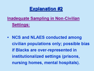 | Although rates of substance use disorders higher in criminal justice system, the absolute difference in institutionalization between Blacks and Whites (about 3%) is insufficient to meaningfully account for differential in prevalence rates (particularly since many whites institutionalized also have high rates). Thus, explanation of "missed cases" is not convincing. |
