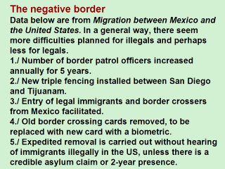 Distinction between exclusion and deportation abolished. 7./ New areas created which have administration decisions cannot be reviewed by the courts. 8./ This includes lack of judicial review of final orders of deportation for most criminal aliens. 9./ In addition, definition of "aggravated felony" is expanded even if imprisonment is suspended. 10./ Certain legalization class action suits pending in courts are no longer subject to judicial review. 11./ Standards for suspension of deportation (now "cancellation of removal") made more restrictive and burden of hardship increased from extreme to exceptional and extremely unusual hardship and harm must be to a US citizen, legal permanent resident spouse, parent or child. 12./ Criminal penalties for immigration violations enhanced. 13./ Legal immigrants barred from usage of supplemental security income and food stamps until they obtain citizenship. 14./ Legal immigrants entering after enactment of Welfare Act barred for 5 years from most federal means-tested programs, including Medicaid. 15./ Welfare reform amended to provide certain exemptions for battered spouses and immigrant children abandoned by parents. 16./ Immigration affidavits of support raised to 125 % of poverty level and made binding on sponsors until naturalization or forty quarters of employment by sponsored alien. 17./ Aliens made inadmissible as legal immigrants for 3 years if illegally present in US for 180 days to 1 year, for 10 years if present for 1 year or more, permanently if previously convicted of an aggravated felony; plus other grounds for inadmissibility. 18./ Pilot programs to verify employment eligibility implemented. 19./ Persons unlawfully in U.S. are not eligible for social security benefits or post-secondary education. 20./ Attorney General permitted to enter into written agreements with state and local agencies to perform functions previously exclusive to federal immigration agents. After so many negatives, let’s try one positive. Political empowerment is the best path for achieving objectives. This has led to an increase in citizenship applications of legal immigrants. This particularly affects legal Mexican immigrants who, as a group, have heretofore been slow to naturalize. Why have they been slow to vote, especially in California? |