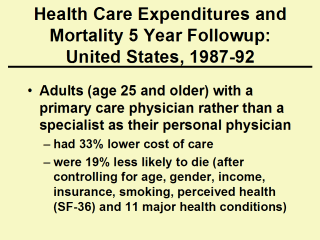Source: Franks P, Fiscella K. Primary care physicians and specialists as personal physicians. Health care expenditures and mortality experience. J Fam Pract 1998; 47(2):105-109. |
