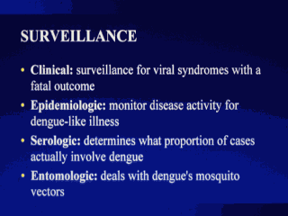 Aedes aegypti densities. An effective dengue surveillance system must address the disease from both a clinical and an entomological perspective as well as consider the virologic, epidemiologic, and serologic aspects that are useful in an active surveillance system. Surveillance for dengue and dengue hemorrhagic fever/dengue shock syndrome can be either active or passive. Currently, most surveillance for these diseases has been passive - that is, it has depended upon case reports from the medical community that have recognized dengue-like illnesses. In most tropical countries where dengue transmission is reported, the surveillance system is of the passive type, with health authorities waiting until transmission is recognized by the medical services and detected through the routine reporting system. This type of surveillance is typically very insensitive because of the low index of suspicion on the part of the physicians and the difficulties inherent in clinical differential diagnosis. Additionally, many patients treat themselves at home and do not seek medical treatment. Thus, by the time dengue cases are detected and reported by the medical community in a passive surveillance system, substantial transmission has already occurred and even may have peaked. By then it is generally too late to have much impact upon epidemic transmission, even though intensive mosquito control measures may be implemented. The alternative strategy is active surveillance, which entails actively monitoring dengue infections in the community at all times. |