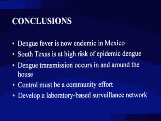 There is no specific treatment for dengue fever. Moreover, vaccine development is difficult since any of four different dengue serotypes may cause the disease, and because protection against only one or two of these serotypes might actually increase the risk of more serious disease. Nevertheless, progress is being made in the development of vaccines that may protect against all four serotypes. At present, the only method of controlling or preventing dengue and dengue hemorrhagic fever is to combat the vector mosquito which, in Asia and America, breeds primarily in man-made containers such as bottles, cans, used tires and other items that retain water. In Africa, however, it breeds both in artificial containers as well as in natural habitats. Control of dengue at the present time is dependent on control of the principal vector, Aedes Aegypti. Efforts to achieve such control must now be focused on community education and action towards eliminating this mosquito's breeding sites near human dwellings. As a result of the continued infestation of the South Texas/Lower Rio Grande Valley with Aedes Aegypti, indigenous transmission along the United States-Mexico border remains a public health concern for both governments. Yet, the political boundary that artificially separates the two nations belies the true interdependence, both economic and social, on either side. Ultimately, it is this political boundary that determines in the end how any or all concerns about public health along the United States-Mexico border must be addressed -- with diplomacy and cooperation through the international political process. |