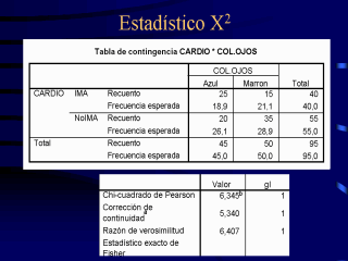 Los grados de libertad de la tabla, necesarios para el cálculo de la P de la distribución, son los valores que puede adoptar si ya conocemos un valor de cada variable. Su cálculo es por tanto: Gl = (filas-1) x (columnas-1) Una tabla 2 x 2 tiene pues 1 grado de libertad [(2-1) X (2-1)] |