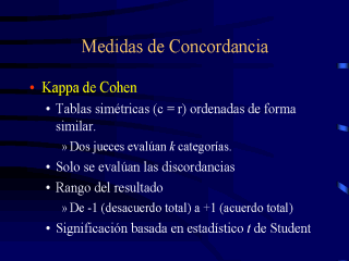 Se admite generalmente que valores <0.2 son de baja-nula concordancia, de 0.2 a 0.5 es concordancia moderada, 0.5 a 0.8 es concordancia alta y >0.8 es muy alta. Se interpreta de modo similar al coef. R de correlación de Pearson, y también puede adoptar valores de –1 (discordancia perfecta) a +1 (concordancia absoluta). |