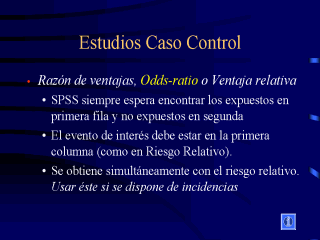 En este caso se usa una aproximación relativa al riesgo relativo, denominada cociente de razones (odds ratio). El concepto de ODDS es el de apuestas anglosajonas. Si tres personas apuestan a favor de un boxeador y seis en contra, decimos que las apuestas (odds) son de 3 a 6, o su equivalente de 2 a 1. En el caso de esudios retrospectivos hacemos un cociente de odds o razón de apuestas entre los afectados y los no afectados. Podemos decir que el índice o apuesta de los afectos es de 3/1 respecto del factor de interés, mientras que en los no afectos es de 3/2. El cociente de razones es por tanto de (3/1)/(3/2) = 2 Para muestras grandes y aleatorizadas podemos suponer que este cociente se aproxima al riesgo relativo real, salvo que hayan claros sesgos de selección de sujetos. |