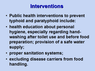 | Control measures to combat typhoid include health education and antibiotic treatment. A vaccine is available, although it is not routinely recommended except for those who will have prolonged exposure to potentially contaminated food and water in high-risk areas. The vaccine does not provide full protection from infection. |