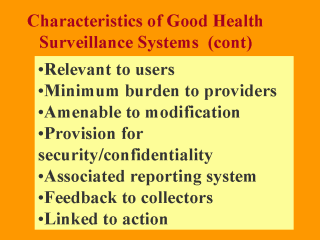 policy-makers, researchers). Obviously to obtain the cooperation of staff in collecting the data, the system should not require great time investment or mental effort. Ideally, should be part of their routine business operation. Having a futuristic approach , data bases should be flexible enough to allow insertion or deletion of fields as the need arises. All information systems containing private or identifiable data items should be secured with access passwords and encryption if information is to be electronically transferred. Having an in-built reporting template system would facilitate production of regular updates. Important but often ignored, is to feedback comments on quality, completeness and usefulness to the people who are directly involved in the collection of data. Finally, information systems are not justifiable if they are not linked to action to address the findings. |