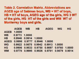 All combinations of AGEB, WB, HB, AGEG, WG, HG and WM have r < 0.95, and form many relations close to absolute ones.
