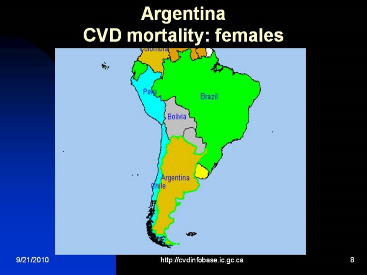Overall, North America has very low CVD mortality rates relatively speaking, for both males and females. The concern is that these rates and the risk factors associated with them are increasing. In Argentina the mortality from CVDs for females is much lower at 176.65 per 100,000 population, about 37.55% of all deaths (1996)