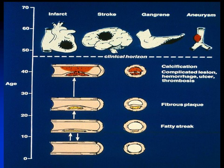 This is an old slide suggesting that fatty streaks only begin in the second decade, based on information from Korean soldiers. We know now from the PDAY study and more recent information that this whole process is accelerated such that fatty streaks are now sometimes seen in infancy and certainly before the age of 5 years, with atherosclerotic disease by the twenties and thirties. |